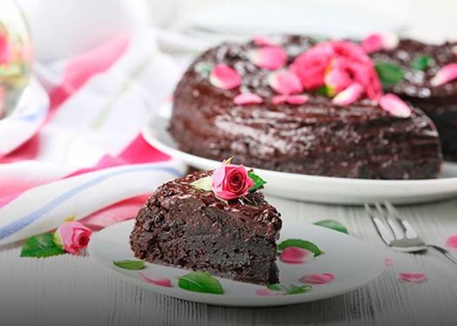 - Vychladený korpus už len polejte pripravenou ganachou, ozdobte čokoládovým posypom a okvetnými lístkami ruže.